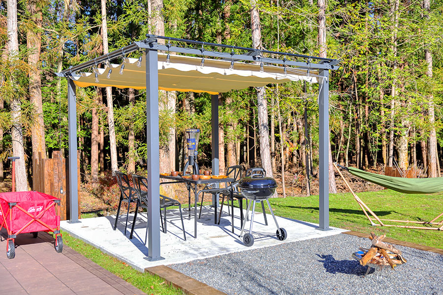 帳篷旁設有可於晴天使用的專用BBQ空間。遇上惡劣天氣時,亦可在管理棟的專用空間內安心享受BBQ。