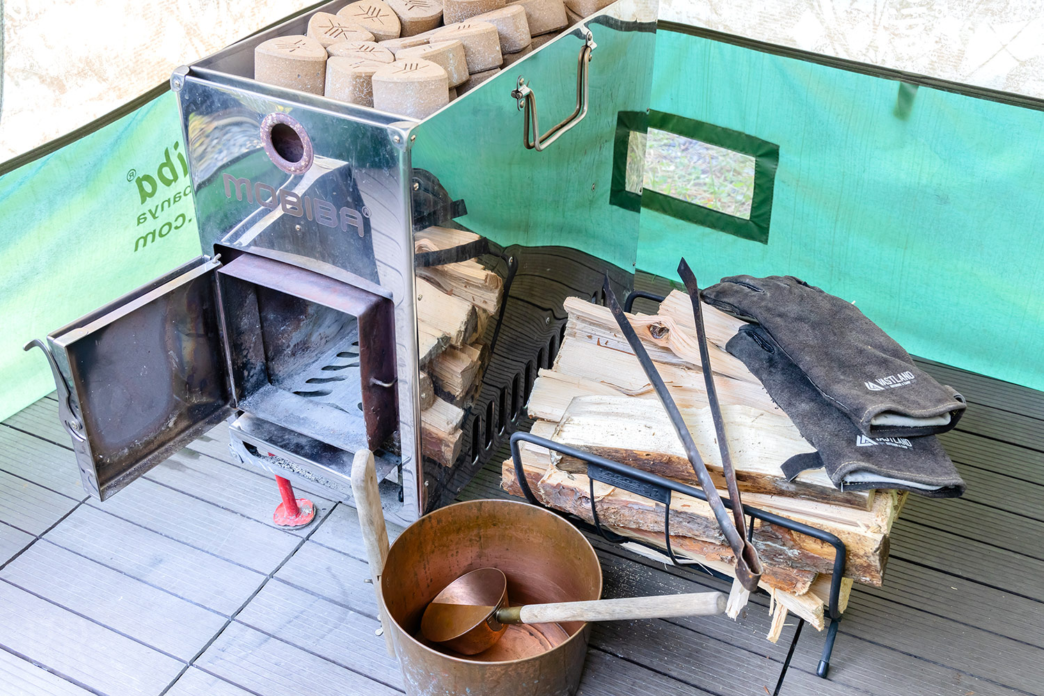 帳篷桑拿、水、木柴兩捆、拖鞋、大毛巾、面巾、網狀床、兩張椅子及桌子。